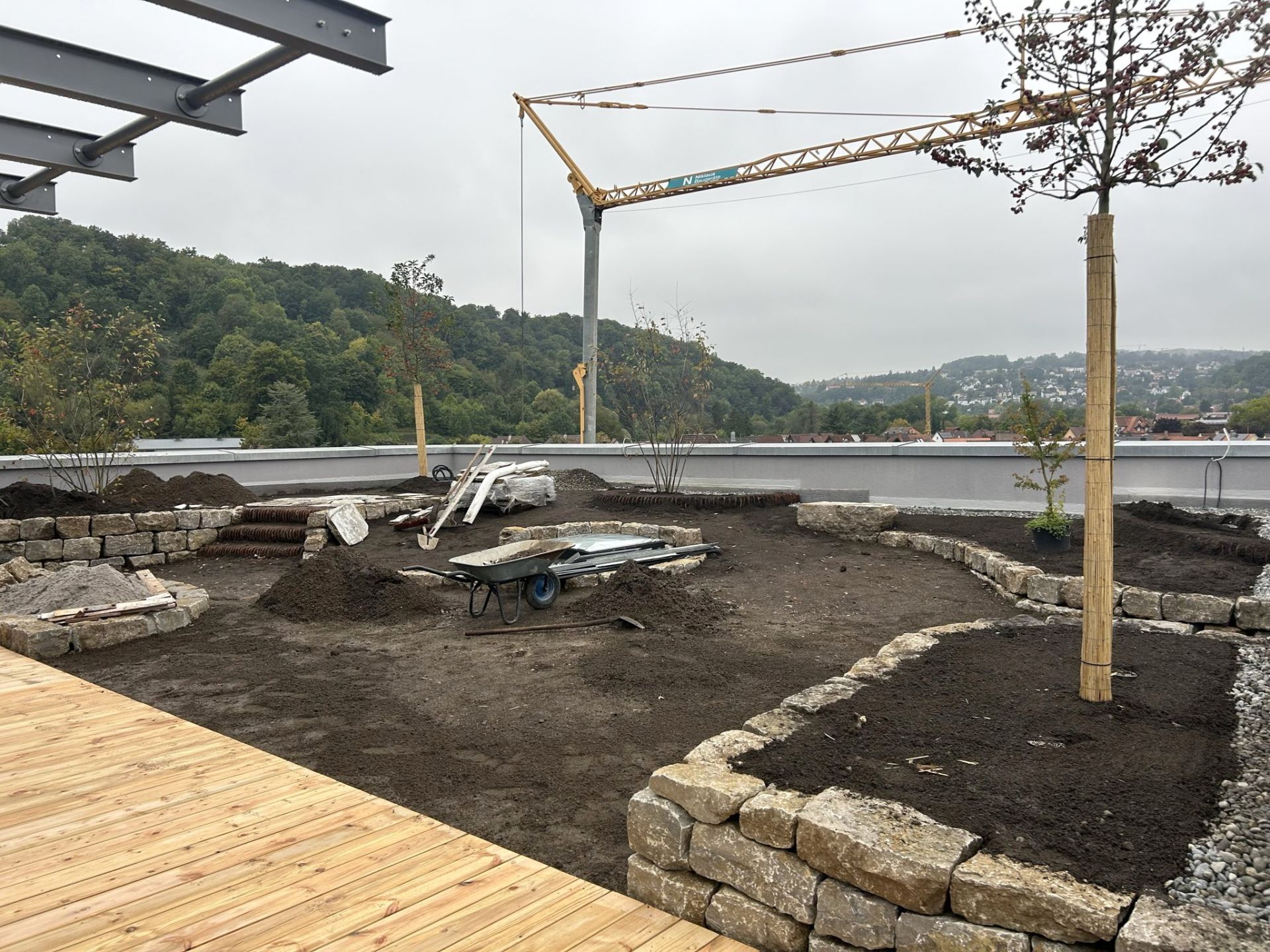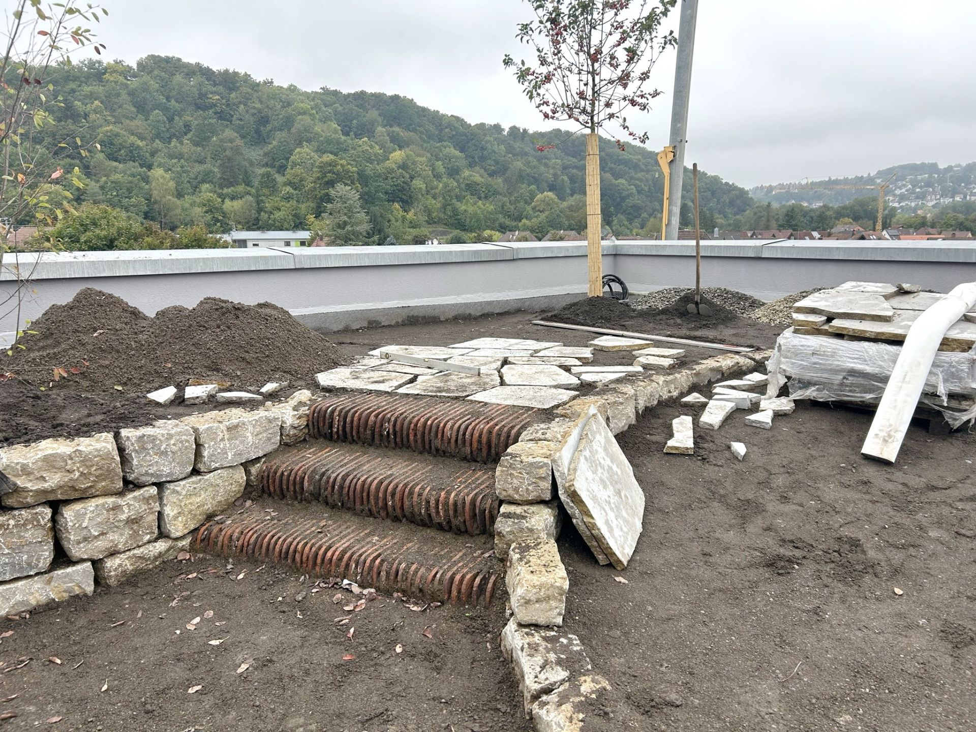 Der kleine Dachgarten im dritten Obergeschoss eines neu gebauten Mehrfamilienhauses in Tübingen, den wir euch Anfang September bereits vorgestellt hatten, nimmt Gestalt an. Mittlerweile sind der Holzsteg und die Terrasse ebenso wie die meisten Trockenmauern fertiggestellt. Auch die Gehölze haben wir schon gepflanzt. Die Treppe aus 200 Jahre alten Bebenhäuser Dachplatten ist ein ganz besonderes Schmuckstück geworden. Momentan widmen wir uns noch dem Sitzplatz mit Polygonalplattenbelag und der Außendusche. Es wird nicht mehr lange dauern, bis dieses kleine Schmuckstück hoch über den Dächern des neuen Quartiers Aeulehöfe fertiggestellt ist.
