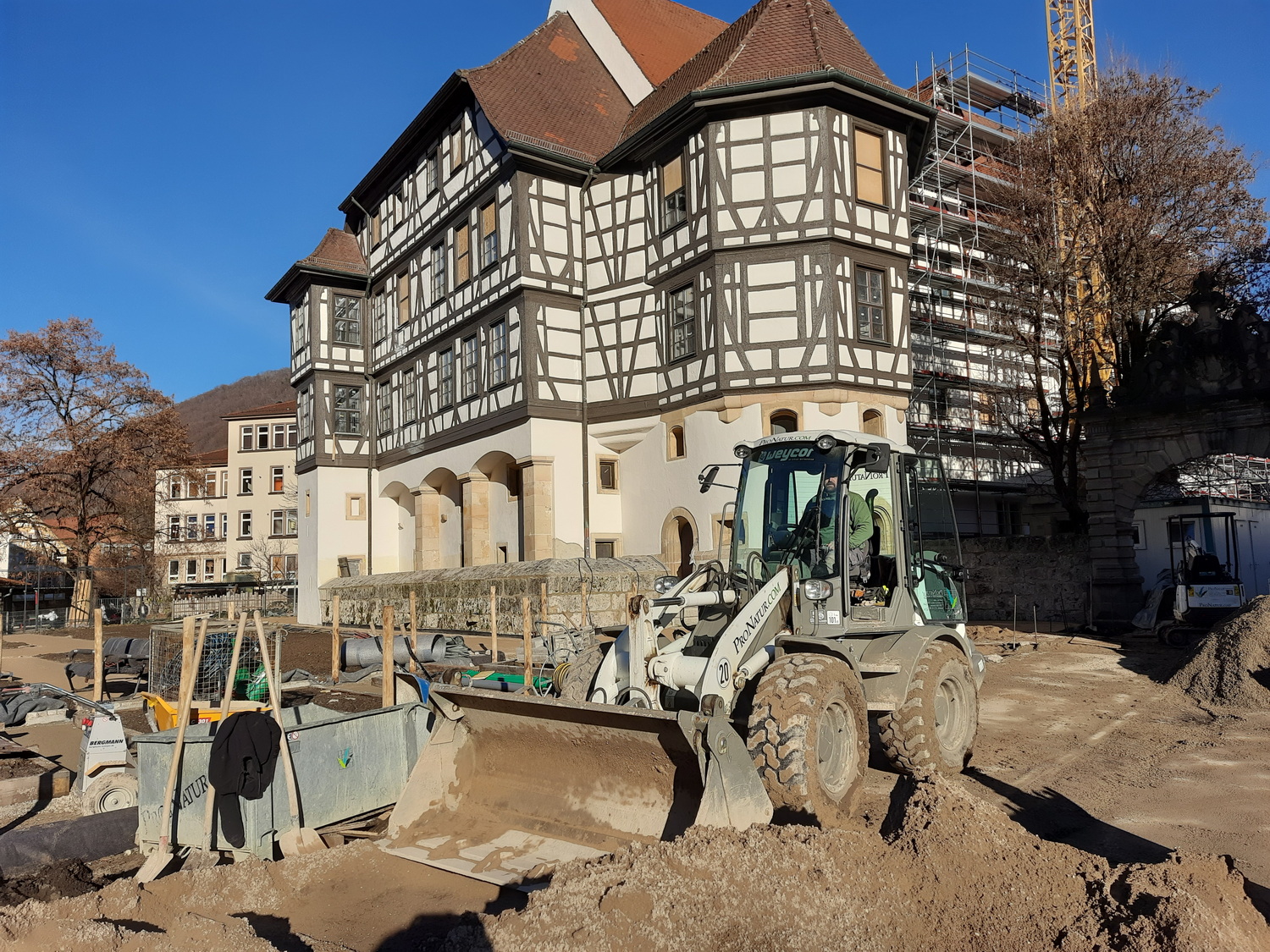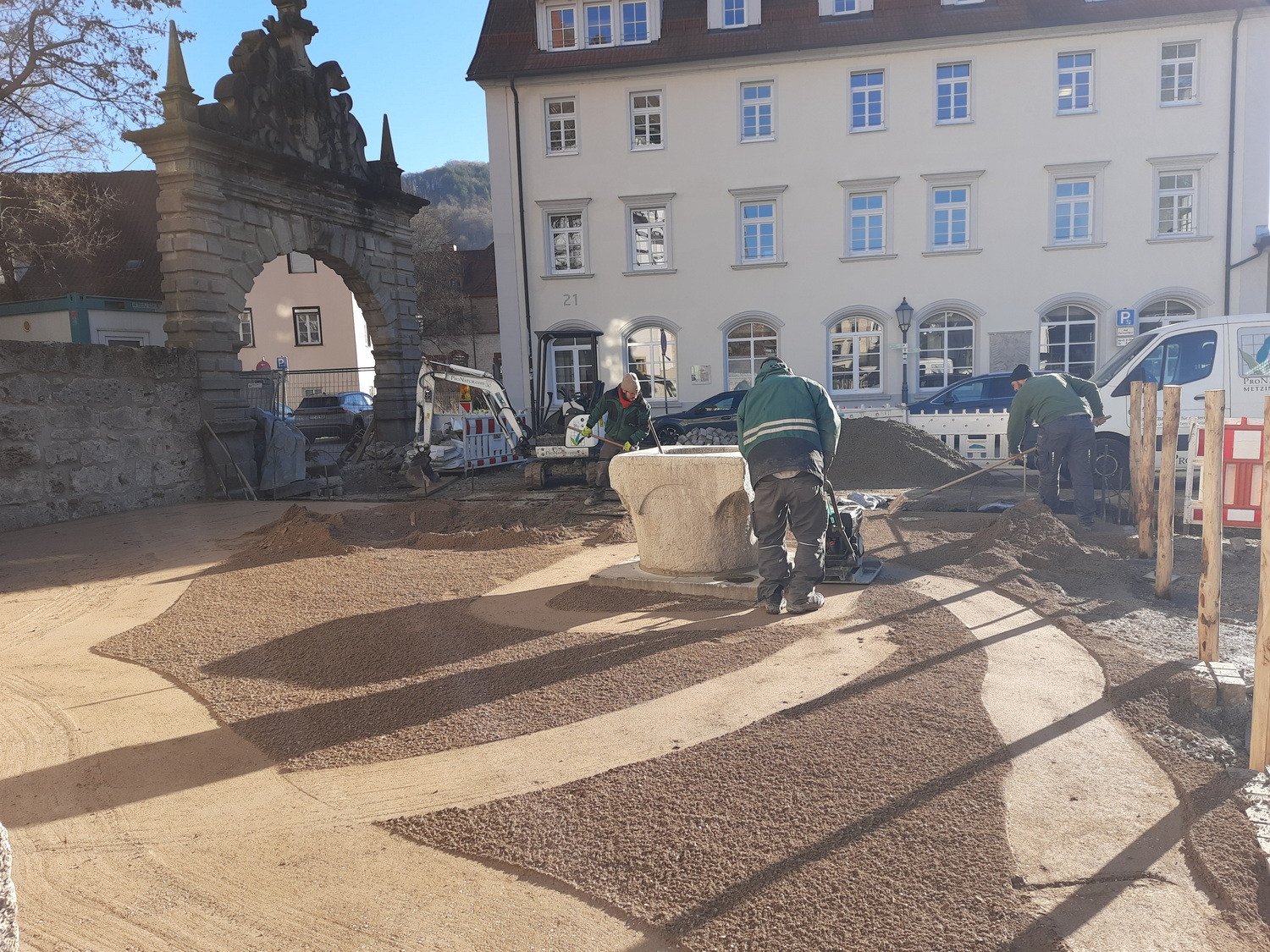 Die Arbeiten am Renaissance-Garten des Residenzschlosses Bad Urach sind schon weit fortgeschritten. Die Fußwege durch den Garten sind fertig gebaut, die Beete vorbereitet. Vor der Schlossfassade lädt eine Sitzmauer zu einer Pause ein. Der rund zwölf Meter lange Laubengang steht, die Beete im Kräutergarten sind angelegt. Bei unserem Besuch am vergangenen Dienstag wurde gerade die Wassergebundene Wegedecke um den Schöpfbrunnen herum gebaut.